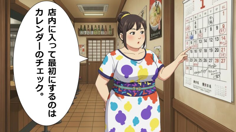 店内に入って最初にするのはカレンダーのチェック。これで出入の業者がわかります。