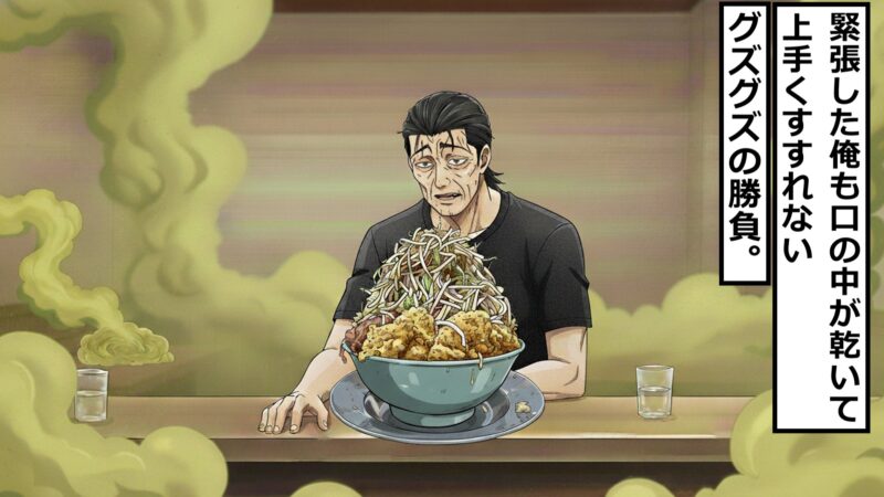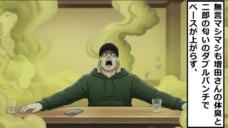 無言マシマシも増田さんの体臭と二郎の匂いのWパンチでペースが上がらず、緊張した俺も口の中が乾いて上手くすすれない。