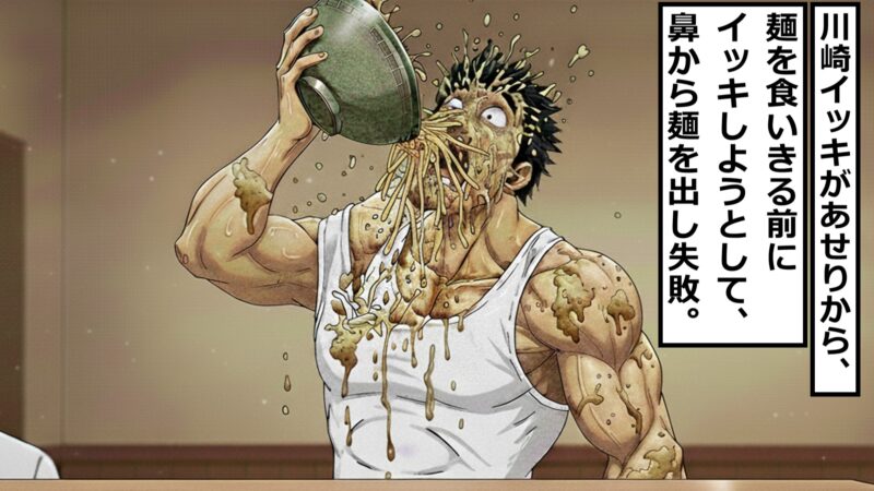バトル開始! 冷静さを忘れたアイスマンがペースを乱し、川崎イッキがあせりから、麺を食いきる前にイッキしようとして、鼻から麺を出し失敗。