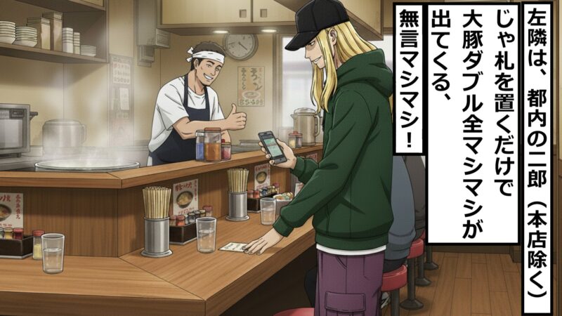 左隣は、都内の二郎(本店除く)じゃ札を置くだけで大豚ダブル全マシマシが出てくる、無言マシマシ!