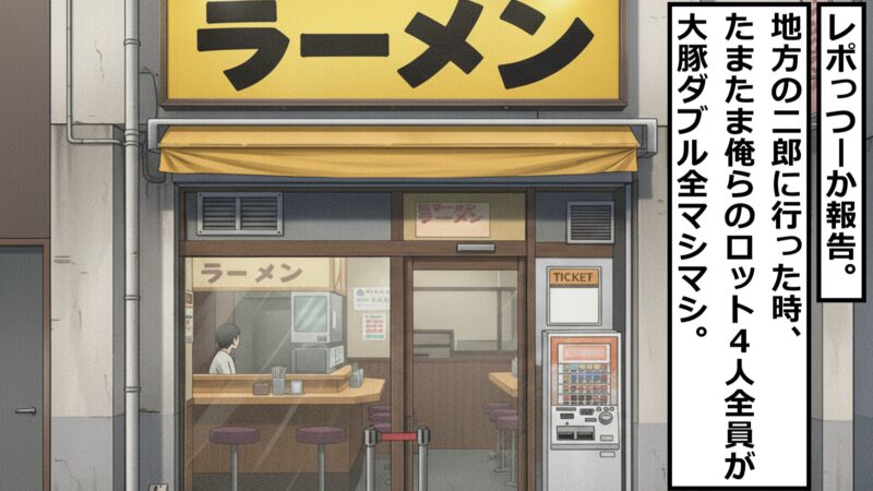 地方の二郎に行った時、たまたま俺らのロット4人全員が大豚ダブル全マシマシ。