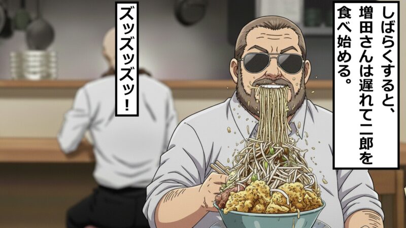 グズグズの勝負。しばらくすると、増田さんは俺らの横に座り遅れて二郎を食べ始める。