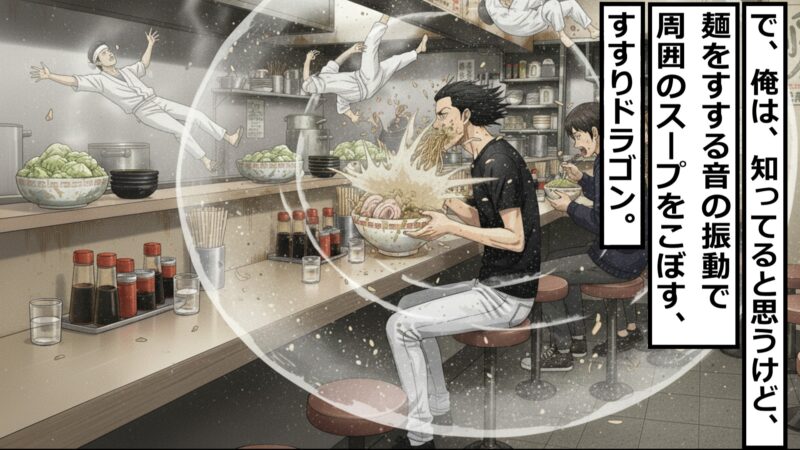 で、俺は、知ってると思うけど、麺をすする音の振動で周囲のスープをこぼす、すすり龍(ドラゴン)。