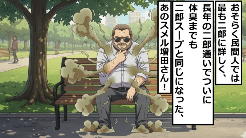 おそらく民間人では最も二郎に詳しく、長年の二郎通いでついに体臭までも二郎スープと同じになった、あのスメル増田さん!